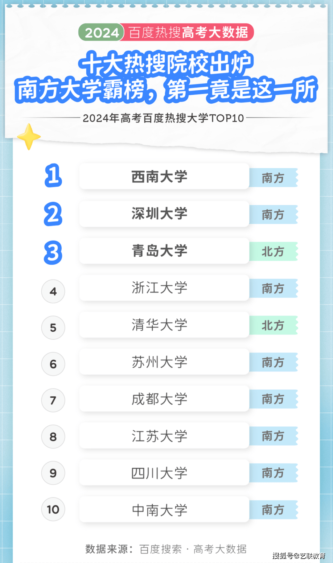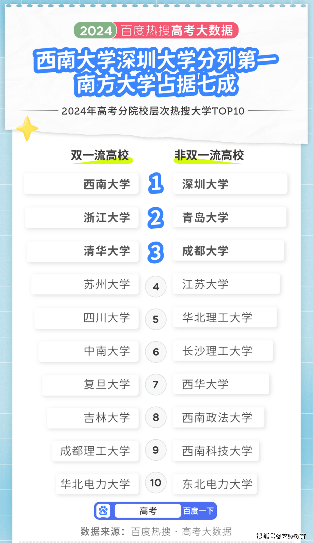 双一流高校中,除了大学、大学、华北电力大学等高校进入热搜之外,余下七成均为南方院校,保守抢手院校如西南大学、浙江大学、姑苏大学、四川大学、中南大学、复旦大学纷纷上榜。非双一流大学中,深圳大学稳居热搜第一,南方大学中除了江苏大学、长沙理工大学,西南地域也有西南大学等4所大学广受青睐。