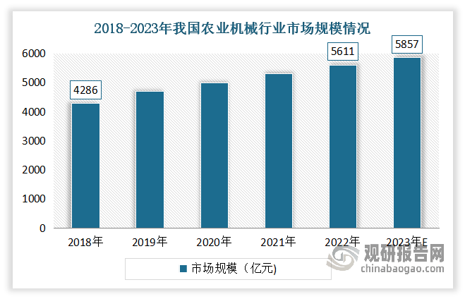 市场不竭扩大。数据显示,2018-2022年我国农业机械行业市场规模由4286亿元增加至5611亿元,年均复合增加率达8。4%。估量2023年我国农业机械市场规模将正在5857亿元摆布。