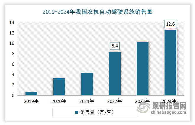正在聪慧农业时代,农机配备的高度智能化成为显著特征,而农机从动驾驶系统则是智能化农机配备不成或缺的焦点组件。近几年跟着农业机械化成长很快,我国农机从动化系统初见成效,总体上曾经进入了高速增加期间。数据显示,2022年我国农机从动驾驶系统发卖量达8。4万/套,同比增加92。22%。估计2024年我国农机从动驾驶系统发卖量将跨越12万/套。